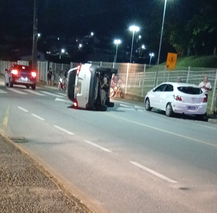 Com o impacto da batida, o carro tombou e ficou lateralizado sobre a pista, exigindo a atuação das equipes de socorro.