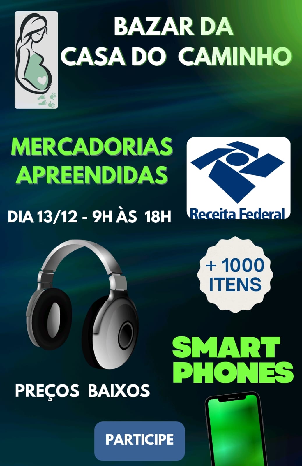 Neste sábado, dia 13, a Associação de Amparo ao Bebê Carente – Casa do Caminho – realiza Bazar Beneficente com diversos produtos apreendidos pela Receita Federal. Serão eletrônicos, smartphones, brinquedos, perfumes, itens de pesca, roupas, acessórios, ferramentas, entre outros.