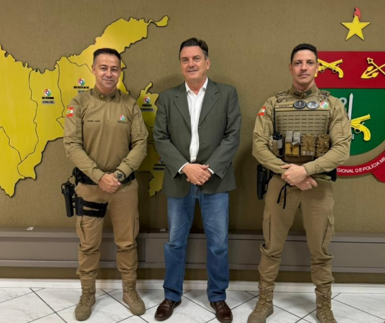 O prefeito de Adriano Zimmermann, juntamente com o comandante da 3ª Companhia do 14º Batalhão da Polícia Militar em Guaramirim, major Anderson Andrey da Silva, cumpriu agenda no 12º Comando Regional de Polícia Militar com o coronel José Luís Cavassin, nesta quinta-feira (23).