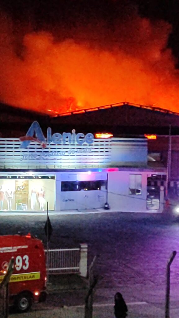 Um incêndio de grandes proporções atingiu um galpão da empresa têxtil Alenice, em Guaramirim, na madrugada deste sábado (31). O local fica às margens da BR-280 e as chamas puderam ser vistas de longe.