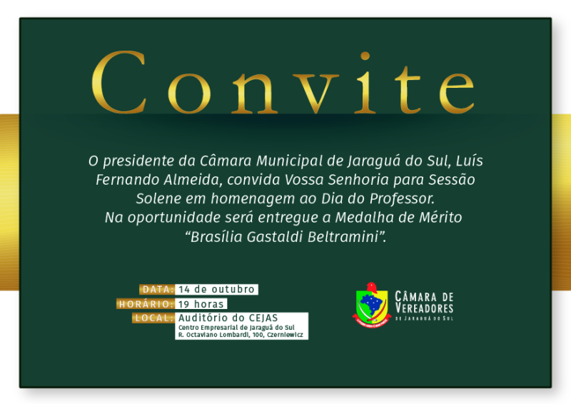 Na próxima terça-feira (14), a Câmara Municipal de Jaraguá do Sul realizará uma solenidade especial em homenagem ao Dia do Professor a educadores que se destacaram na área da educação, além da entrega da Medalha de Mérito Brasília Gastaldi Beltramini. O evento acontecerá no auditório do Centro Empresarial de Jaraguá do Sul (Cejas), a partir das 19h.