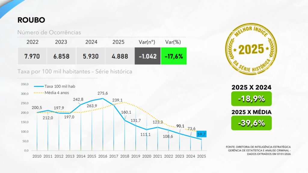 O número de mortes violentas chegou a aproximadamente 625 registros em 2025, resultando em uma taxa de 7,6 por 100 mil habitantes. Em 2024, esse indicador havia sido de cerca de 703 mortes, o que corresponde a 78 ocorrências a menos, redução de 11,1%.