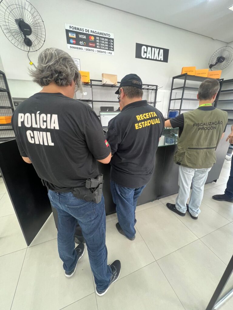 Três frentes simultâneas. A operação foi executada de forma coordenada em três etapas. No dia 28 de janeiro, equipes policiais realizaram fiscalizações em duas lojas localizadas no centro de Jaraguá do Sul. No dia seguinte, 29 de janeiro, uma terceira loja foi fiscalizada em Biguaçu, na Grande Florianópolis.