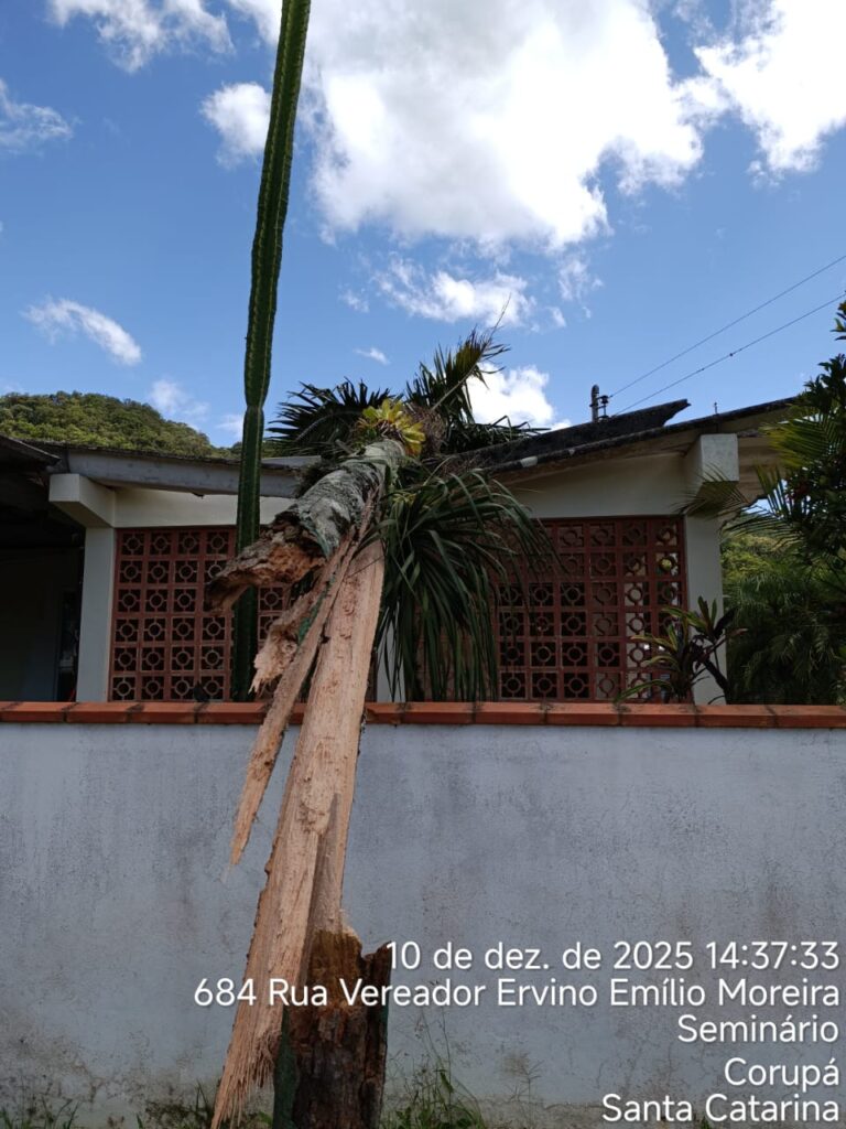 Os fortes ventos que atingiram Corupá na tarde desta quarta-feira (10/12) causaram estragos em diferentes pontos do município, com registro de destelhamentos e quedas de árvores. As equipes da Defesa Civil foram acionadas logo após o início das ocorrências e permanecem nas ruas realizando atendimentos e levantamentos.